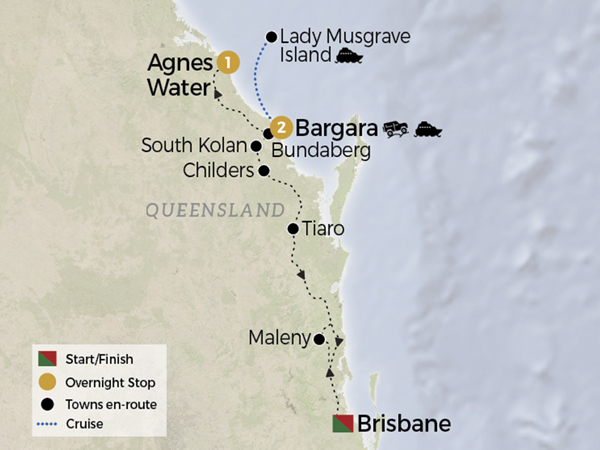 Join us as we journey north along Queensland’s stunning Capricorn Coast! Stay in the Beef Capital of Australia, Rockhampton, and delve into local history with a self-guided tram tour at the Rockhampton Heritage Village. Discover the awe-inspiring Cathedral Cave at Capricorn Caves on a guided tour before setting sail to Great Keppel Island, where a glass-bottom boat cruise reveals a world of colourful coral and marine life. Continue to the charming town of 1770 and experience the thrill of a lifetime aboard the iconic pink LARC. This unforgettable coastal exploration promises adventure, discovery, and the very best of Queensland’s north!