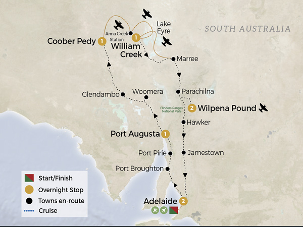 Discover South Australia’s spectacular outback on this 8-day escorted tour. Begin in Adelaide before journeying north through Port Augusta and Woomera to the underground town of Coober Pedy. Take a breathtaking flight over the Painted Hills, Anna Creek Station, and the magnificent Kati Thanda–Lake Eyre, Australia’s largest salt lake. Explore the Flinders Ranges and enjoy a scenic flight over Wilpena Pound’s vast natural amphitheatre. Visit the Jeff Morgan Gallery in Hawker and conclude with a city sights tour of Adelaide. Travel in comfort with locally operated coaches, enjoy 20 meals, and experience breathtaking scenery from sky to desert.