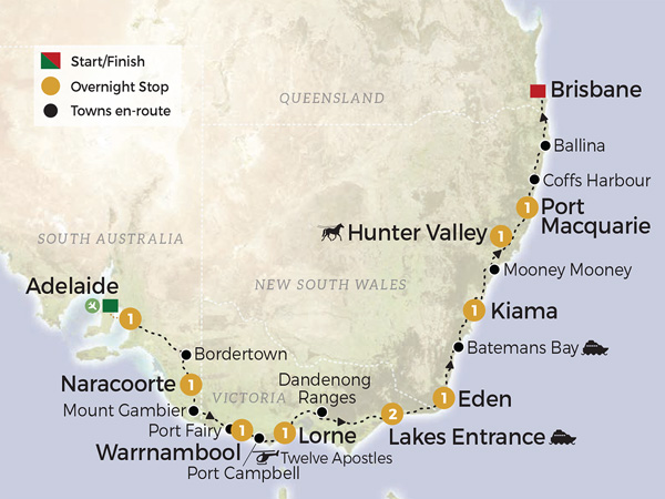 Journey from Adelaide to Brisbane on this breathtaking 11-day adventure through Australia’s coastal and countryside wonders. Explore the UNESCO-listed Naracoorte Caves, marvel at the Twelve Apostles on a scenic helicopter flight, and cruise the tranquil waters of Lakes Entrance and Batemans Bay. Visit charming towns like Port Fairy, Eden, and Kiama, enjoy wine tastings in the Hunter Valley, and unwind in beautiful coastal resorts. With premium accommodation, guided experiences, and fully carbon-neutral travel aboard our luxurious Diamond Class coach, this tour showcases Australia’s natural splendour, fine regional produce, and rich heritage in unforgettable comfort.