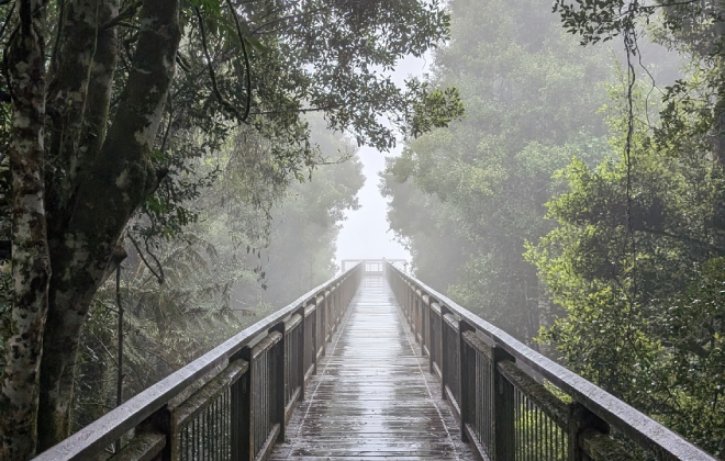 Dorrigo Skywalk is a 70-metre-long boardwalk perched over the escarpment in Dorrigo National Park. The skywalk lookout, elevated 21 metres above the rainforest, offers magnificent views of the national park, across Bellinger Valley and out to Coffs Harbour. McGraths Hump, with its double peak (also known as 'old man sleeping’), is a prominent feature.